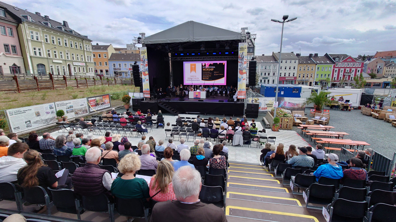 Der Gottesdienst findet im Rahmen von "Bühne Raus" auf der Freifläche am Schillerquartier (ehemals Zentralkauf) statt.