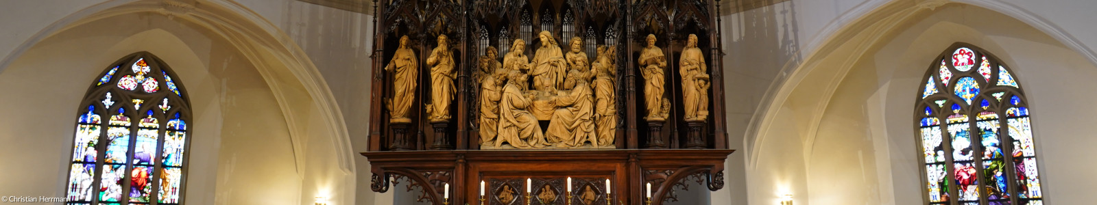 Wir gehen durch den Mittelgang auf den Altar zu. Es ist ein neugotischer Hochaltar von Anselm Sickinger (München). Er wurde 1866 aufgestellt. Schon von weitem ist die Figurengruppe des Abendmahls zu erkennen. Beim Näherkommen fällt die detailreiche Ausführung der Gesichter und das Faltenwurfs auf. Die Szene ist bewegt, Hände und Haltungen der Jünger deuten auf ein lebhaftes Gespräch. Hat nicht eben Jesus gesagt: „Einer unter euch wird mich verraten?“ Die Jünger reagieren bestürzt: „Herr, bin ich’s?“ Unberührt davon empfängt der namenlose „Jünger, den Jesus liebte“ das Brot aus der Hand seines Herrn, während Judas kaum beachtet mit verhülltem Haupt die Gemeinschaft verlässt, den Beutel in der Hand.